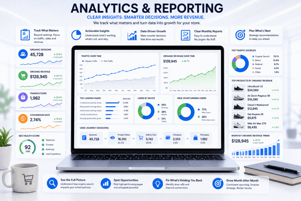 Rankings are useful to track but they are not the whole story. What actually matters is whether more people are finding your store, whether they are buying, and whether organic search is contributing to your revenue in a meaningful way. We set up tracking that gives us a full picture of this. Which pages are driving traffic, which products are getting found, where people are leaving without buying, how organic revenue is trending month over month. Every month we put together a report that makes all of this easy to understand. No jargon, no data dumps. Just a clear view of what is working and what comes next.