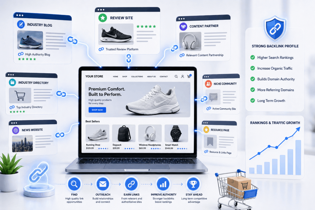 Links from other websites are still one of the strongest signals Google uses to decide which stores deserve to rank. For ecommerce, getting those links is genuinely competitive. Most good link opportunities require real outreach and relationship building, not shortcuts. We go after links from websites that are relevant to your industry, your products, and your audience. Industry directories, trusted review platforms, content partnerships. We are selective because one good link from a credible source does more for your rankings than twenty low quality ones. Built consistently over time, a strong backlink profile becomes one of your store’s biggest competitive advantages in search.