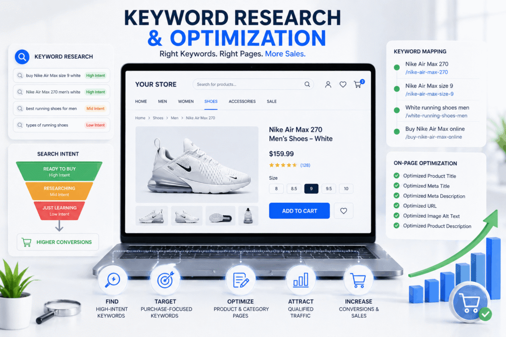 Not all search traffic is equal. Someone searching for “types of running shoes” is doing research. Someone searching for “buy Nike Air Max size 9 white” is about to spend money. Those are very different people and they need to be targeted very differently. We find the keywords that sit closest to a purchase decision and build your store’s pages around them. Product titles, descriptions, meta tags, category names, URLs. All of it gets looked at and optimised with the right terms in the right places. The traffic that comes in as a result is far more likely to convert than traffic from broad or informational keywords.